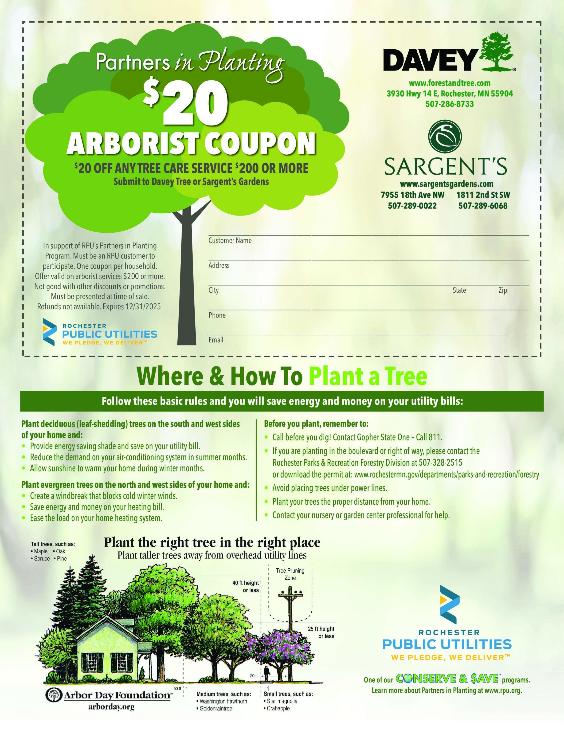 Through our Partners in Planting program, RPU also collaborates with local businesses to help you grow a greener Rochester. We've teamed up with Jim Whiting Nursery & Garden Center and Sargent’s Gardens to offer a $20 discount on qualifying deciduous shade trees. In addition, we've partnered with Davey Tree, a trusted local arborist, to provide $20 off a a professional tree service. Click here to download our Partners in Planting brochure.