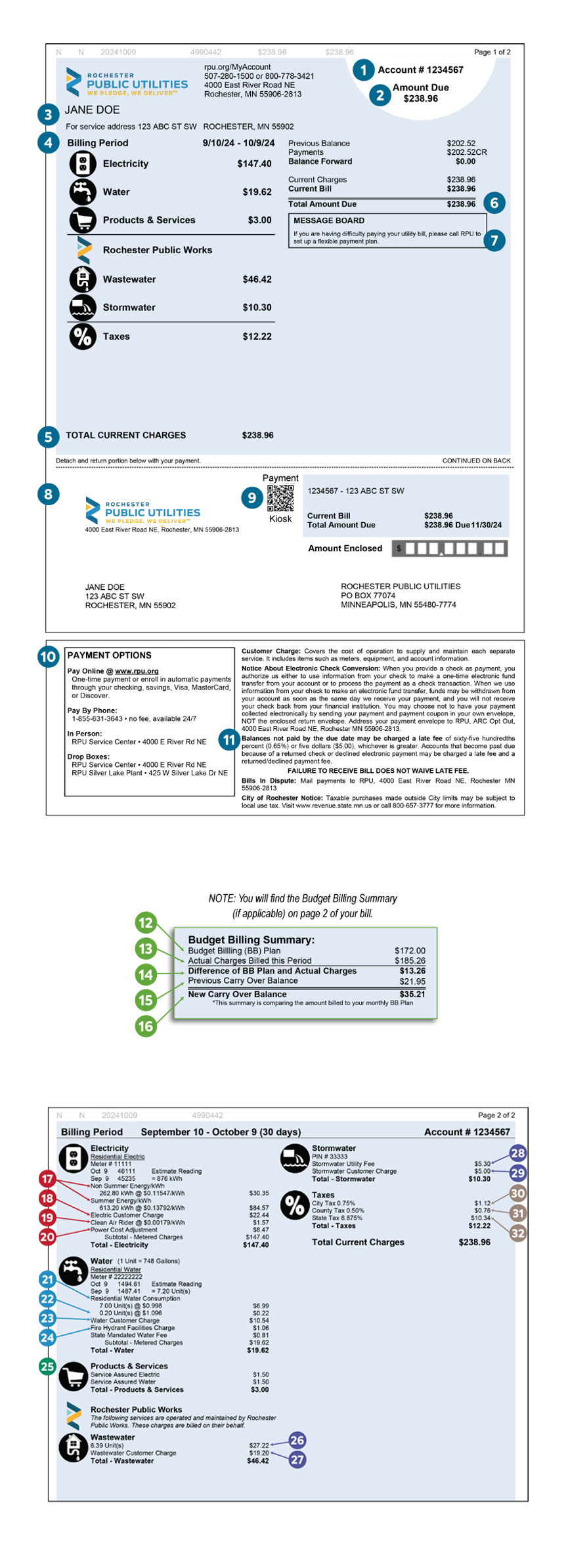 Your RPU bill can provide you with important information beyond your “Total Amount Due" each month. By looking over your bill and understanding each component, you will be better prepared to know who to contact with questions regarding RPU or Rochester Public Works charges, how to conserve electricity and water, what special products and services you are enrolled in, and where there are opportunities to save!